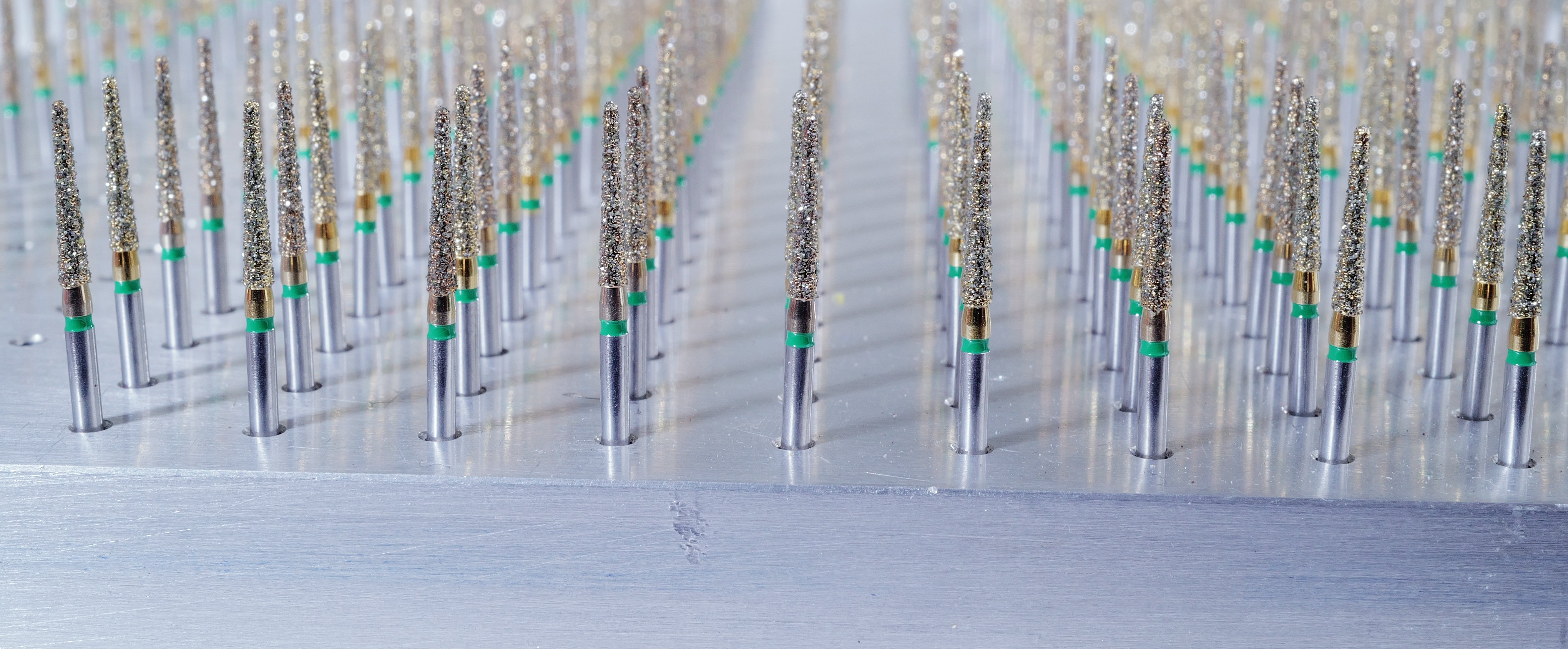 Diamanten, die fast wie Zähne nachwachsen. Repetierbare Diamantbeschichtung in galvanischer Bindungsmatrix.Die mehrlagigen Kornschichten werden von elektrolytisch aufgetragenem Reinnickel fixiert. Ein elektroerosiver Prozess sichert Kühldrainagen für den Substanzabtrag bei der Präparation. Beim Repetieren wird das abgenutzte Diamantkorn freigesetzt; an dessen Stelle tritt ein neues, scharfes Korn.