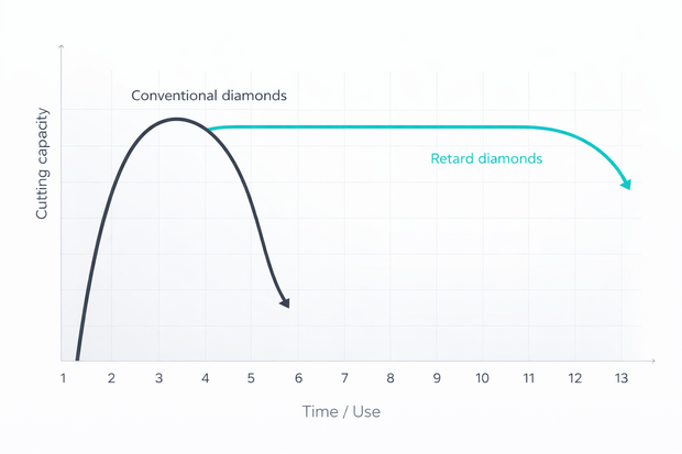 In-vitro Tests und Praxiserfahrungen über 20 Jahre haben bewiesen, dass RETARD-Diamanten länger schneiden als konventionelle Instrumente. Die lange Schnittleistung macht den RETARD wirtschaftlich.