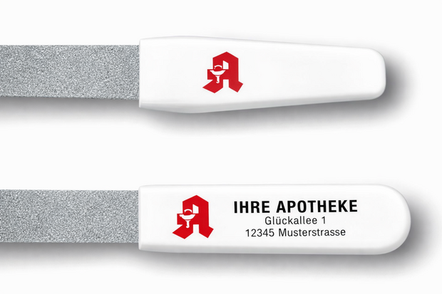 Wer schenkt, bleibt im Kontakt. Mit individuell gestalteten Saphir-Nagelfeilen schaffen Sie eine langlebige Erinnerung an Ihre Apotheke – direkt im Alltag Ihrer Kunden.