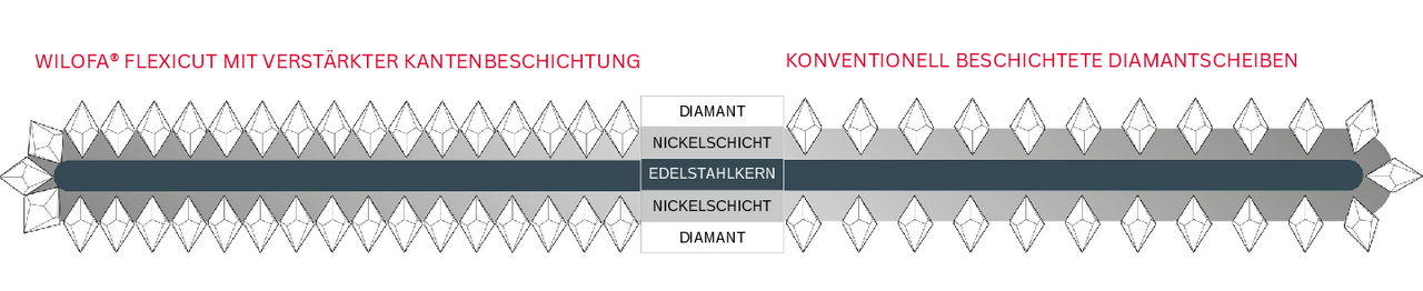 WILOFA® Flexicut Diamantscheiben sind das Ergebnis ambitionierter Entwicklungsarbeit und praktischer Bewährung. Rostfreier Stahl erhielt durch eine spezielle Temperung eine hohe Flexibilität und Rückstellkraft. Im Kantenbereich wurde die Scheibe durch eine spezielle Diamantbeschichtung besonders schnittfreudig und standfest.