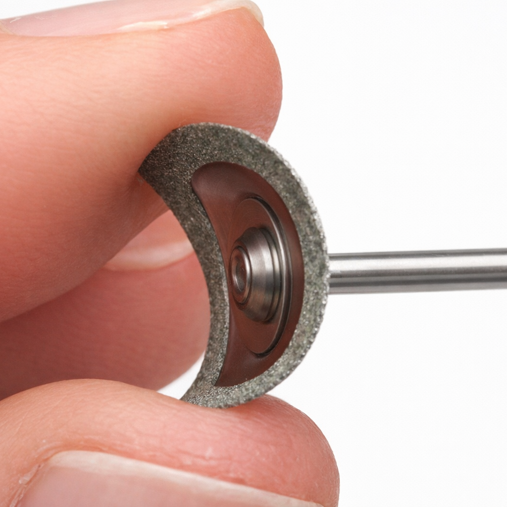 Das Formschleifen der geschichteten Aufbrennkeramik wie VITA VM9 auf Oxidkeramikgerüsten oder auf VMK-Kronen und -Brücken gehört zu den Aufgaben feinkörniger, flexibler Diamantscheiben. Aber Achtung: Schwach diamantierte Scheibenkanten verschleißen schnell, lösen eine punktuelle Überhitzung mit Schwarzverfärbung auf dem rohgebrannten Werkstück aus und verursachen Mikrorisse in der Keramikstruktur.